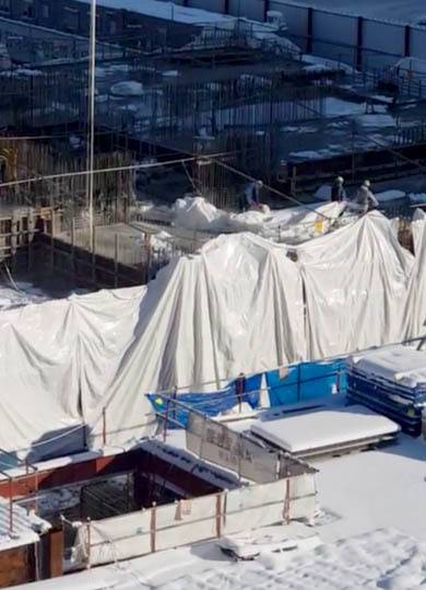 [광주=뉴시스] 변재훈 기자 = 광주 현대산업개발 신축 아파트 붕괴 사고가 난 2단지와 인접한 1단지 현장에서 2020년 12월~지난해 1월 사이 눈발 날리는 궂은 날씨 속 콘크리트 타설 강행한 직후 보양천을 걷어내는 모습. (사진=독자 제공) 2022.01.15. photo@newsis.com *재판매 및 DB 금지