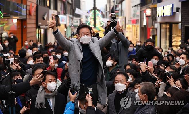 (춘천=연합뉴스) 백승렬 기자 = 더불어민주당 이재명 대선후보가 15일 강원도 춘천시 명동거리를 방문, 시민들과 인사하고 있다. 2022.1.15