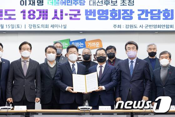 (춘천=뉴스1) 오대일 기자 = 이재명 더불어민주당 대선 후보가 강원도 매타버스(매주 타는 민생버스) 민생투어 첫 날인 15일 강원 춘천시 강원도의회에서 열린 강원도 18개 시군 번영회장 간담회에서 정책 건의문을 전달받고 있다. 2022.1.15/뉴스1