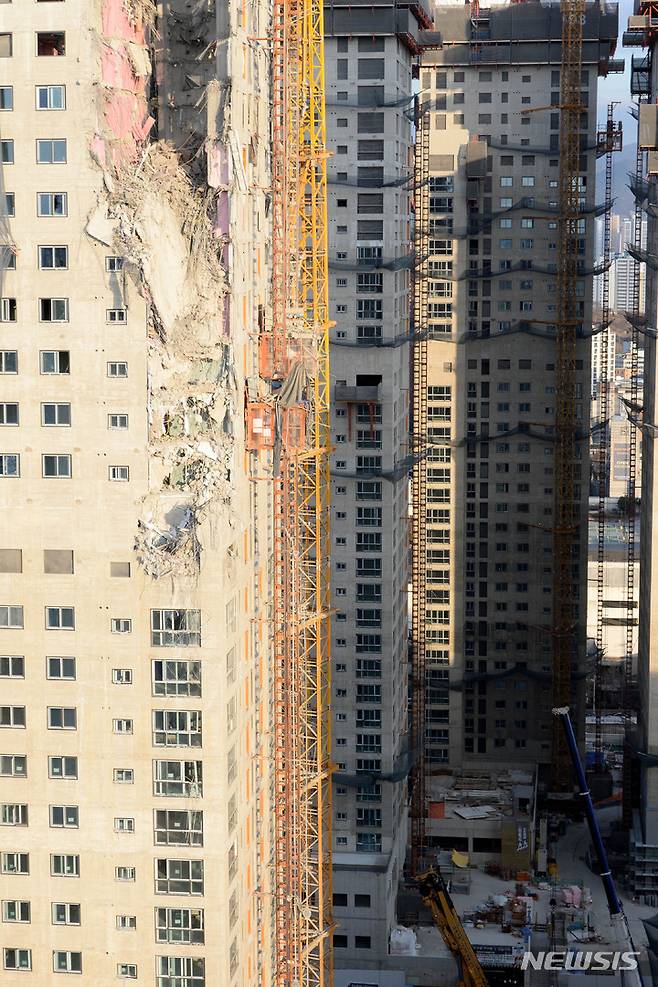 [광주=뉴시스] 변재훈 기자 = 15일 오후 광주 서구 화정동 현대산업개발 신축 아파트 붕괴 사고 현장에서 중장비를 동원한 수색 작업이 펼쳐지고 있다. 지난 11일 사고 발생 이후 닷새째를 맞이한 이날까지 1명이 숨지고 5명이 실종됐다. 2022.01.15. wisdom21@newsis.com