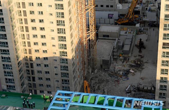 [광주=뉴시스] 변재훈 기자 = 15일 오후 광주 서구 화정동 현대산업개발 신축 아파트 붕괴 사고 현장에서 중장비를 동원한 수색 작업이 펼쳐지고 있다. 지난 11일 사고 발생 이후 닷새째를 맞이한 이날까지 1명이 숨지고 5명이 실종됐다. 2022.01.15. wisdom21@newsis.com