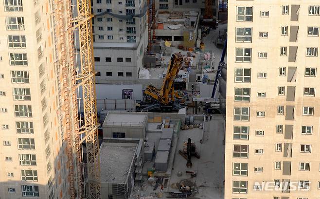 [광주=뉴시스] 변재훈 기자 = 15일 오후 광주 서구 화정동 현대산업개발 신축 아파트 붕괴 사고 현장에서 중장비를 동원한 수색 작업이 펼쳐지고 있다. 지난 11일 사고 발생 이후 닷새째를 맞이한 이날까지 1명이 숨지고 5명이 실종됐다. 2022.01.15. wisdom21@newsis.com