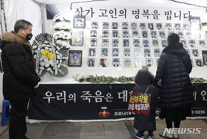 [서울=뉴시스] 조수정 기자 = 15일 오후 서울 청계광장 코로나19 백신피해자가족협의회(코백회) 코로나19 백신 희생자 합동 분향소에서 시민들이 헌화를 하고 있다. 코백회는 정부의 백신 안전성 재검토, 피해보상 전문위원회 심의과정 공개, 백신 피해자 특별법 제정 등을 촉구하고 있다. 2022.01.15. chocrystal@newsis.com