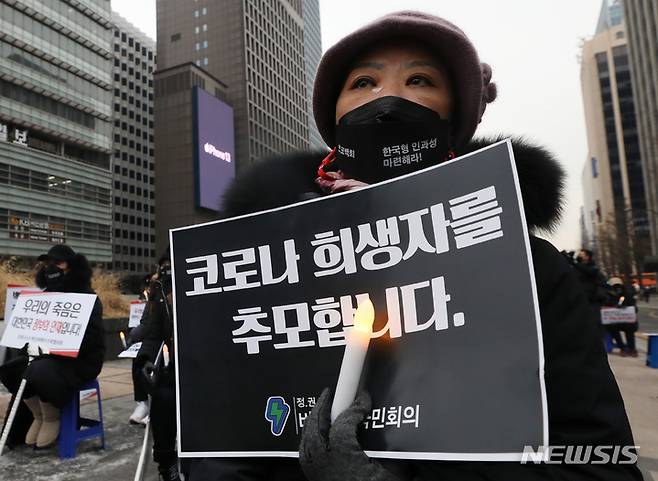 [서울=뉴시스] 조수정 기자 = 코로나19 백신피해자가족협의회(코백회) 등 백신 접종후 사망자 유가족들이 15일 오후 서울 청계광장에서 제9회 추모식 및 촛불집회를 하고 있다. 이들은 정부의 백신 안전성 재검토, 피해보상 전문위원회 심의과정 공개, 백신 피해자 특별법 제정 등을 촉구했다. 2022.01.15. chocrystal@newsis.com