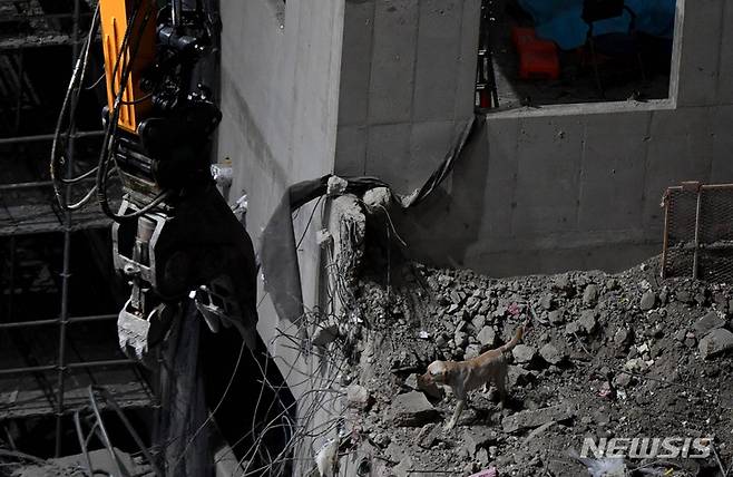 [광주=뉴시스] 변재훈 기자 = 15일 오후 광주 서구 화정동 현대산업개발 신축 아파트 붕괴 사고 현장에서 인명구조견을 동원한 야간 수색 작업이 펼쳐지고 있다. 지난 11일 붕괴 이후 닷새째를 맞이한 이날까지 이 사고로 1명이 숨지고 5명이 실종됐다. 2022.01.15. wisdom21@newsis.com