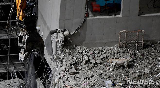 [광주=뉴시스] 변재훈 기자 = 15일 오후 광주 서구 화정동 현대산업개발 신축 아파트 붕괴 사고 현장에서 인명구조견을 동원한 야간 수색 작업이 펼쳐지고 있다. 지난 11일 붕괴 이후 닷새째를 맞이한 이날까지 이 사고로 1명이 숨지고 5명이 실종됐다. 2022.01.15. wisdom21@newsis.com