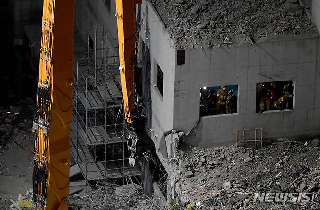[광주=뉴시스] 변재훈 기자 = 15일 오후 광주 서구 화정동 현대산업개발 신축 아파트 붕괴 사고 현장에서 대형 중장비를 동원한 야간 수색 작업이 펼쳐지고 있다. 지난 11일 붕괴 이후 닷새째를 맞이한 이날까지 이 사고로 1명이 숨지고 5명이 실종됐다. 2022.01.15. wisdom21@newsis.com