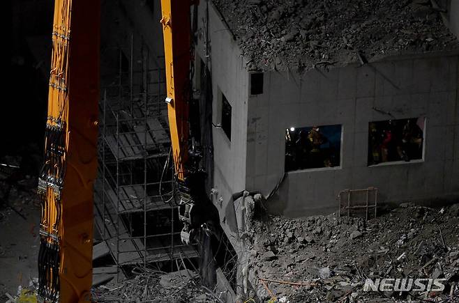[광주=뉴시스] 변재훈 기자 = 15일 오후 광주 서구 화정동 현대산업개발 신축 아파트 붕괴 사고 현장에서 대형 중장비를 동원한 야간 수색 작업이 펼쳐지고 있다. 지난 11일 붕괴 이후 닷새째를 맞이한 이날까지 이 사고로 1명이 숨지고 5명이 실종됐다. 2022.01.15. wisdom21@newsis.com