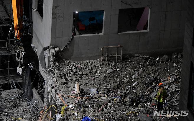 [광주=뉴시스] 변재훈 기자 = 15일 오후 광주 서구 화정동 현대산업개발 신축 아파트 붕괴 사고 현장에서 인명구조견을 동원한 야간 수색 작업이 펼쳐지고 있다. 지난 11일 붕괴 이후 닷새째를 맞이한 이날까지 이 사고로 1명이 숨지고 5명이 실종됐다. 2022.01.15. wisdom21@newsis.com