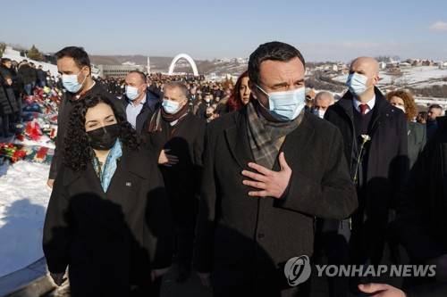 epa09686840 Prime Minister of the Republic of Kosovo Albin Kurti (C-R) and President Vjosa Osmani (C-L) visit the graves of 44 ethnic Albanian civilians killed in 1999 during the war between Serb security forces and Albanian guerrillas, in the village of Racak, Kosovo, 15 January 2022. Kosovo institutions on 14 January 2022 rejected a call by western allies to allow Kosovar ethnic Serbs to vote on Serbia's upcoming referendum on judicial reforms. EPA/VALDRIN XHEMAJ