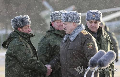 Belarusian President Alexander Lukashenko, second right, greets military top officials during meeting with peacekeepers of the Collective Security Treaty Organization after their withdrawal from Kazakhstan, on military airport near Minsk, Belarus, Saturday, Jan.15, 2022. In light of unprecedented mass protests that quickly grew violent, Kazakh President Kassym-Jomart Tokayev requested help from the Collective Security Treaty Organization, a Russia-led military alliance of six ex-Soviet states. The bloc sent over 2,000 troops to Kazakhstan last week, and on Tuesday Tokayev declared their mission largely complete. (Maxim Guchek/BelTA Pool Photo via AP) POOL PHOTO
