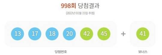 로또복권 운영사 동행복권은 제998회 로또복권 추첨에서 '13, 17, 18, 20, 42, 45'가 1등 당첨번호로 뽑혔다고 15일 밝혔다. 2등 보너스 번호는 '41'이다.