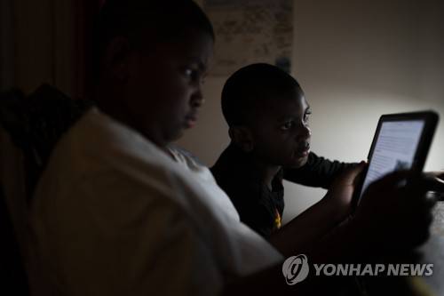 Adam Schneider, 7, center, reads on a tablet computer with his older brother Isaiah, 9, in their bedroom, Wednesday, Dec. 8, 2021, in the Brooklyn borough of New York. Their mother April Schneider says she is lucky her two oldest children attend the same school and can share technology. "When one computer is down, we can us the other," said Schneider. "There needs to be more computers. More staff. More outreach." (AP Photo/John Minchillo)