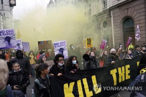 Protesters march during the 'Kill the Bill' march on the national day of action in London, Saturday, Jan. 15, 2022. Protesters march in London, Bristol, Coventry, Newcastle, Liverpool, Sheffield, Plymouth and more ahead of the Lords' final vote on the bill on January 17. (AP Photo/Alberto Pezzali)