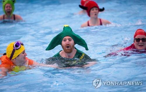 epa09687146 Swimmers wearing fancy dress swim in the Crisis icebreaker cold water challenge at Tooting Bec Lido in London, Britain, 15 January 2022. Participants raising money for homeless charity, Crisis, must swim a width of the swimming pool in either individual or team relay events in the unheated pool, which today was three degrees Celsius. EPA/VICKIE FLORES