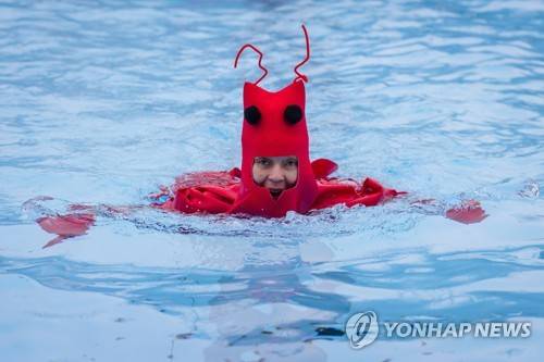 epa09687141 A swimmer wearing fancy dress swims in the Crisis icebreaker cold water challenge at Tooting Bec Lido in London, Britain, 15 January 2022. Participants raising money for homeless charity, Crisis, must swim a width of the swimming pool in either individual or team relay events in the unheated pool, which today was three degrees Celsius. EPA/VICKIE FLORES