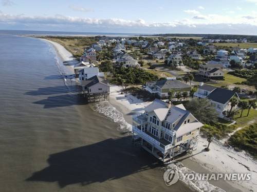 FILE - Water laps the bottom level of four homes in Harbor Island, S.C., Saturday, Oct. 30, 2021, which had to be abandoned after years of beach erosion and damage from Hurricane Matthew in 2016. Facing state budgets that are flush with cash, Democratic and Republican governors alike want to spend part of their windfalls on projects aimed at slowing climate change and guarding against its consequences, from floods and fires to cleaning up dirty air. (AP Photo/Rebecca Blackwell, File) FILE PHOTO