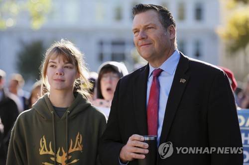 Former Kansas Secretary of State Kris Kobach, right, follows a rally against COVID-19 vaccine mandates with his oldest daughter, 15-year-old Reagan, left, outside the Kansas Statehouse in Topeka, Kan., on Oct. 30, 2021. Kobach is running for Kansas attorney general and the Republican primary race is focusing on resisting Democratic President Joe Biden's policies in court. (AP Photo/John Hanna)