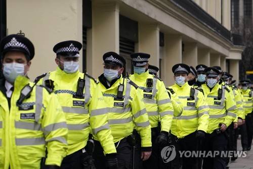 Police forces guard the 'Kill the Bill' march on the national day of action in London, Saturday, Jan. 15, 2022. Protesters march in London, Bristol, Coventry, Newcastle, Liverpool, Sheffield, Plymouth and more ahead of the Lords' final vote on the bill on January 17. (AP Photo/Alberto Pezzali)