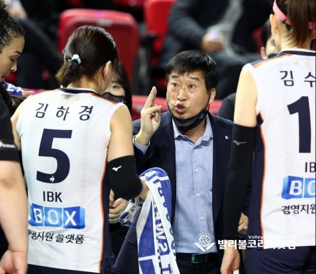 【발리볼코리아닷컴(인천)=김경수 기자】15일(토) 인천시 부평구 삼산월드체육관에서 열린 프로배구 도드람 2021-2022 V리그 4라운드 여자부 흥국생명vsIBK기업은행 인천경기에서 IBK기업은행 김호철감독이 벤치에서 세터 김하경에게 작전을 지시하고 있다. 2022.01.15.