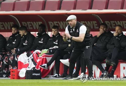 Cologne's head coach Steffen Baumgart urges his players on from the technical area during the German Bundesliga soccer match between FC Cologne and Bayern Munich in Cologne, Germany, Saturday, Jan. 15, 2022. (AP Photo/Martin Meissner) The deutsche fussball liga dfl does not allow the images to be used as sequences to emulate video.