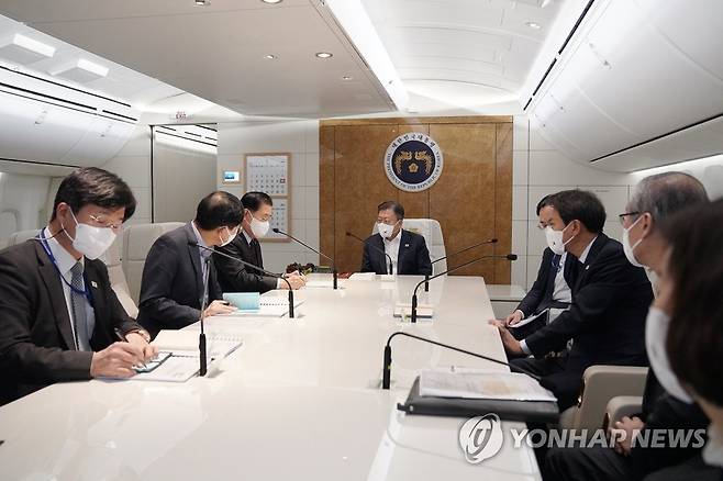 (성남=연합뉴스) 서명곤 기자 = 아랍에미리트연합(UAE), 사우디아라비아, 이집트 등 중동 3개국 순방에 나선 문재인 대통령이 15일 오후 성남 서울공항에서 이륙 직후 공군 1호기에서 회의를 하고 있다. 2022.1.16