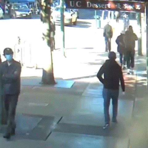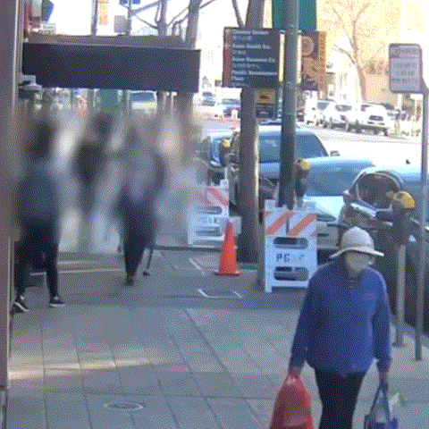 오클랜드 경찰이 공개한 CCTV 영상을 보면, 흑인 남성은 통화하며 길을 걷다 앞에 있는 아시아계 노인을 발견하고는 걸음을 재촉합니다.