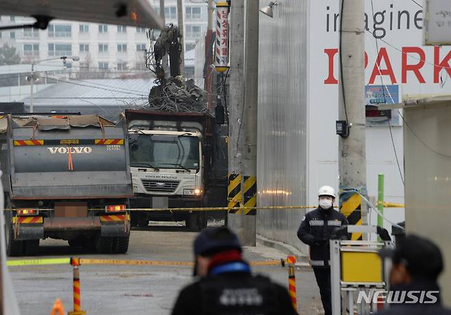 [광주=뉴시스] 변재훈 기자 = 광주 현대산업개발 신축아파트 붕괴 엿새째인 16일 오전 광주 서구 화정동 붕괴 사고 현장에서 대형 중장비를 동원한 수색 작업이 펼쳐지고 있다. 지난 11일 붕괴 이후 엿새째인 이날까지 이 사고로 1명이 숨지고 5명이 실종됐다. 2022.01.16. wisdom21@newsis.com
