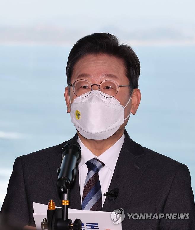 (고성=연합뉴스) 백승렬 기자 = 더불어민주당 이재명 대선후보가 16일 강원도 고성군 통일전망대를 방문, 평화경제정책을 발표하고 있다. 2022.1.16