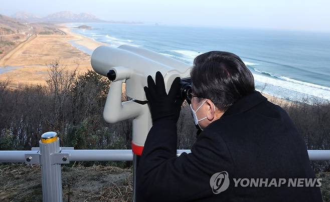 (고성=연합뉴스) 백승렬 기자 = 더불어민주당 이재명 대선후보가 16일 강원도 고성군 통일전망대를 방문, 망원경으로 북녘땅을 바라보고 있다. 2022.1.16
