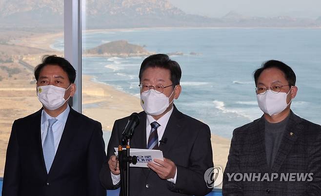 (고성=연합뉴스) 백승렬 기자 = 더불어민주당 이재명 대선후보가 16일 강원도 고성군 통일전망대를 방문, 평화경제정책을 발표하고 있다. 2022.1.16