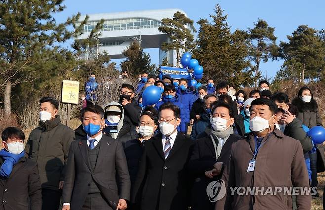 (고성=연합뉴스) 백승렬 기자 = 더불어민주당 이재명 대선후보가 16일 강원도 고성군 통일전망대를 방문, 평화경제정책을 발표한 뒤 전망대를 걸어서 내려오고 있다. 2022.1.16