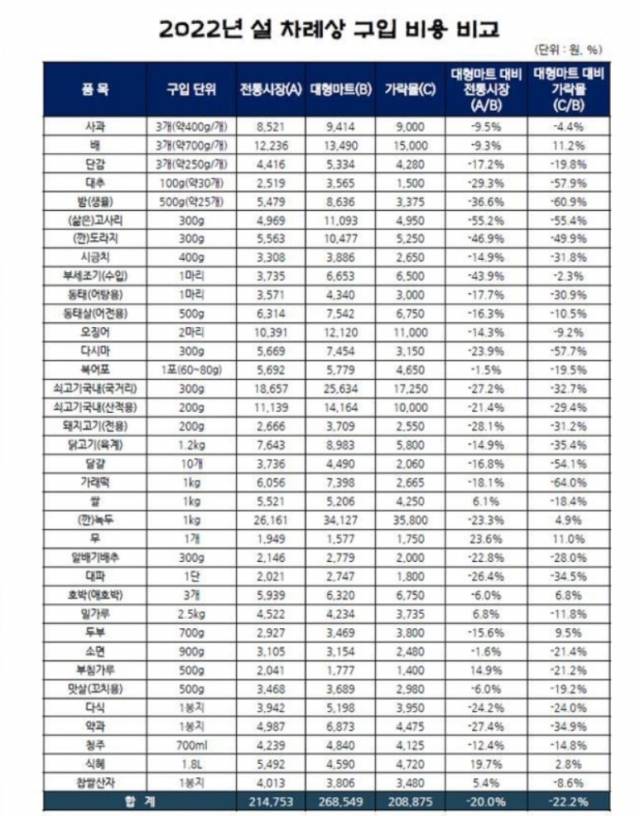 서울시농수산식품공사는 16일 서울시내 5개 권역생활권 7개구의 전통시장, 대형마트 및 가락시장 가락몰 등 총 22곳을 대상으로 올해 설 차례상 구매비용을 조사한 결과를 발표했다.