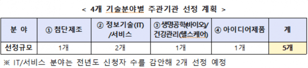 중기부는 2100명 이상의 예비창업자의 창업 아이디어별 분야에 따라 특화형 창업교육을 지원할 4개 기술 분야의 5개 주관기관(IT분야가 2개 기관)을 선정해 기관별로 3억원 내외의 사업비를 지급할 예정이다. 주관기관별 예산은 교육생 모집 비율에 따라 차등 지원한다.