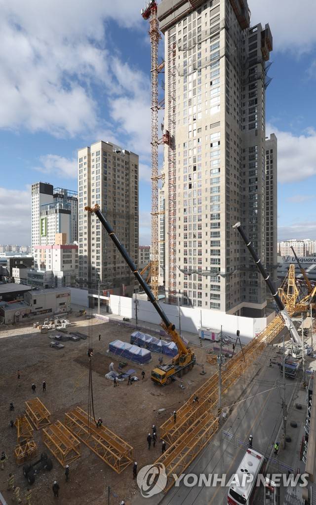 (광주=연합뉴스) 김도훈 기자 = 광주 서구 신축아파트 붕괴사고 발생 엿새째인 16일 관계자들이 타워크레인 해체 작업에 투입될 크레인 조립 작업을 하고 있다. 2022.1.16