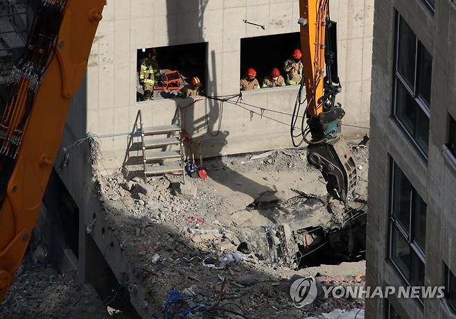 (광주=연합뉴스) 조남수 기자 = 광주 신축 아파트 붕괴 사고 엿새째에 접어든 16일 오후 119구급대원들이 구조활동하고 있다. 2022.1.16