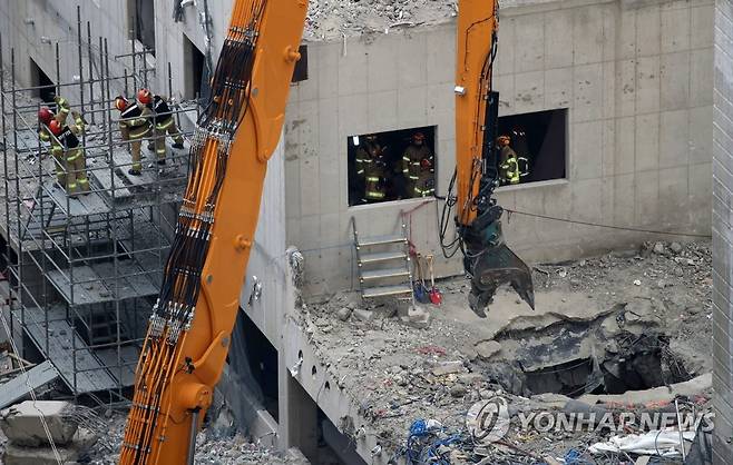 (광주=연합뉴스) 조남수 기자 = 광주 신축 아파트 붕괴 사고 엿새째에 접어든 16일 오후 119구급대원들이 구조활동하고 있다. 2022.1.16