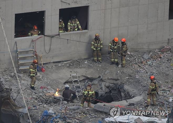 (광주=연합뉴스) 조남수 기자 = 광주 신축 아파트 붕괴 사고 엿새째에 접어든 16일 오후 구조대원들이 구조활동하고 있다. 2022.1.16
