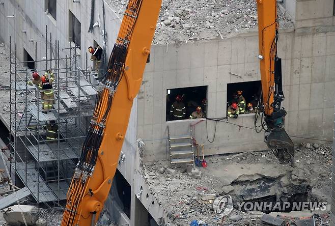 (광주=연합뉴스) 조남수 기자 = 광주 신축 아파트 붕괴 사고 엿새째에 접어든 16일 오후 119구급대원들이 구조활동하고 있다. 2022.1.16