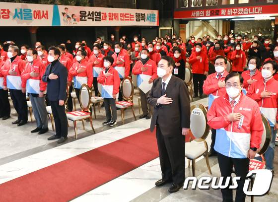 (서울=뉴스1) 이동해 기자 = 윤석열 국민의힘 대선 후보가 16일 오후 서울시 마포구 케이터틀에서 열린 서울시당 선거대책위원회 필승 결의대회 에서 국민의례를 하고 있다. 2022.1.16/뉴스1