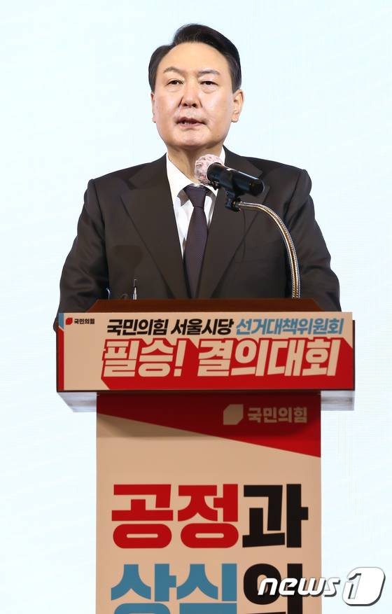 (서울=뉴스1) 이동해 기자 = 윤석열 국민의힘 대선 후보가 16일 오후 서울시 마포구 케이터틀에서 열린 서울시당 선거대책위원회 필승 결의대회에서 연설을 하고 있다. 2022.1.16/뉴스1