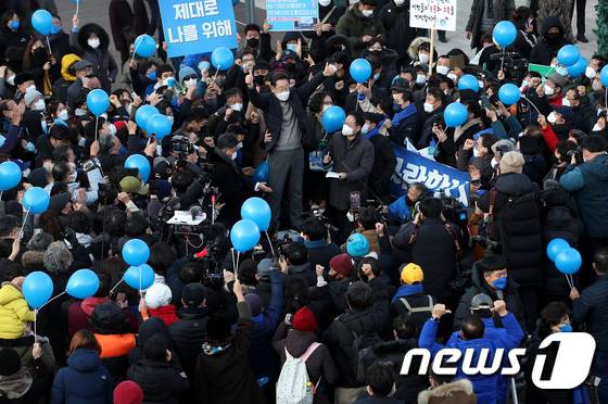 (강릉=뉴스1) 오대일 기자 = 매타버스 시즌2 민생투어를 재개한 이재명 더불어민주당 대선 후보가 16일 오후 강원도 강릉시 중앙성남전통시장에서 즉석 거리연설을 마친 후 양손을 들어 인사하고 있다. 2022.1.16/뉴스1