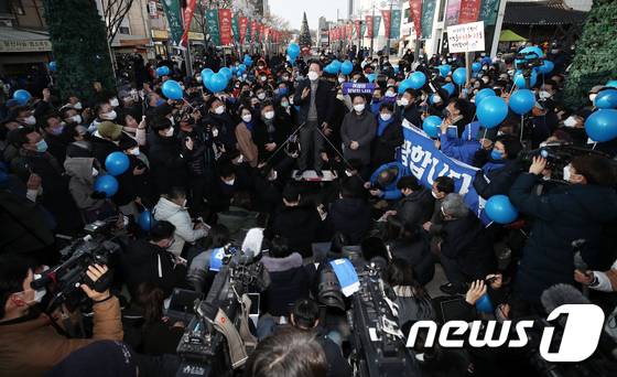(강릉=뉴스1) 오대일 기자 = 매타버스 시즌2 민생투어를 재개한 이재명 더불어민주당 대선 후보가 16일 오후 강원도 강릉시 중앙성남전통시장에서 열린 즉석 거리연설에서 지지를 호소하고 있다. 2022.1.16/뉴스1