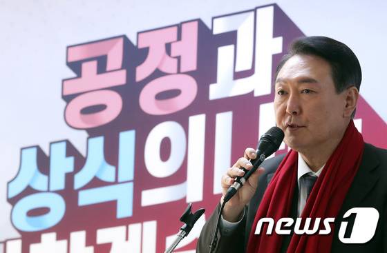 (서울=뉴스1) 이동해 기자 = 윤석열 국민의힘 대선 후보가 16일 오후 서울 영등포구 대하빌딩에서 열린 국민의힘 여성지방의원 임명장 수여식에 참석해 발언을 하고 있다. 2022.1.16/뉴스1