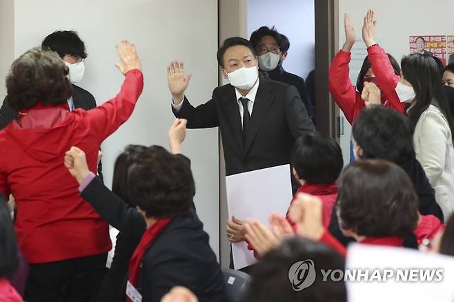 (서울=연합뉴스) 하사헌 기자 = 국민의힘 윤석열 대선 후보가 16일 오후 서울 영등포구 대하빌딩에서 열린 국민의힘 여성지방의원 임명장 수여식에 참석하며 인사하고 있다. 2022.1.16 [국회사진기자단]