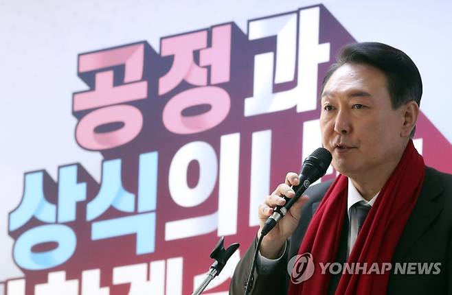 (서울=연합뉴스) 하사헌 기자 = 국민의힘 윤석열 대선 후보가 16일 오후 서울 영등포구 대하빌딩에서 열린 국민의힘 여성지방의원 임명장 수여식에서 발언하고 있다. 2022.1.16 [국회사진기자단]
