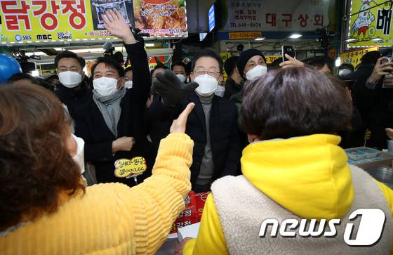 (강릉=뉴스1) 오대일 기자 = 매타버스 시즌2 민생투어를 재개한 이재명 더불어민주당 대선 후보가 16일 오후 강원도 강릉시 중앙성남전통시장을 방문해 상인들과 인사하며 지지를 호소하고 있다. 2022.1.16/뉴스1