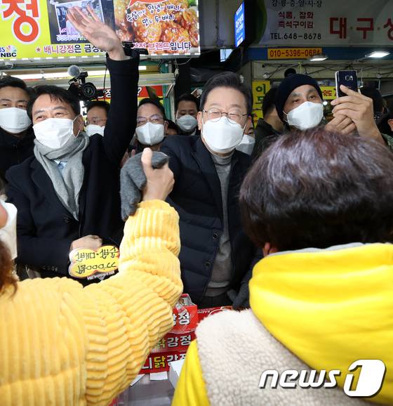 (강릉=뉴스1) 오대일 기자 = 매타버스 시즌2 민생투어를 재개한 이재명 더불어민주당 대선 후보가 16일 오후 강원도 강릉시 중앙성남전통시장을 방문해 상인들과 인사하며 지지를 호소하고 있다. 2022.1.16/뉴스1