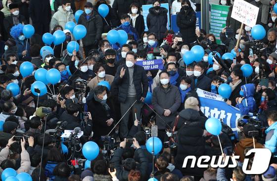 (강릉=뉴스1) 오대일 기자 = 매타버스 시즌2 민생투어를 재개한 이재명 더불어민주당 대선 후보가 16일 오후 강원도 강릉시 중앙성남전통시장에서 열린 즉석 거리연설에서 지지를 호소하고 있다. 2022.1.16/뉴스1