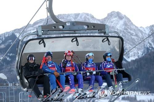 epa09688775 Polish President Andrzej Duda (C) sits in a ski lift on the ski slope during the 8th edition of the charity event in alpine skiing '12H Zakopane Slalom Marathon 2022' at Szymoszkowa Glade in Zakopane, Poland, 16 January 2022. This event raises funds for the Foundation Handicap-Zakopane to host year-round sports training for disabled people in the region. EPA/GRZEGORZ MOMOT POLAND OUT